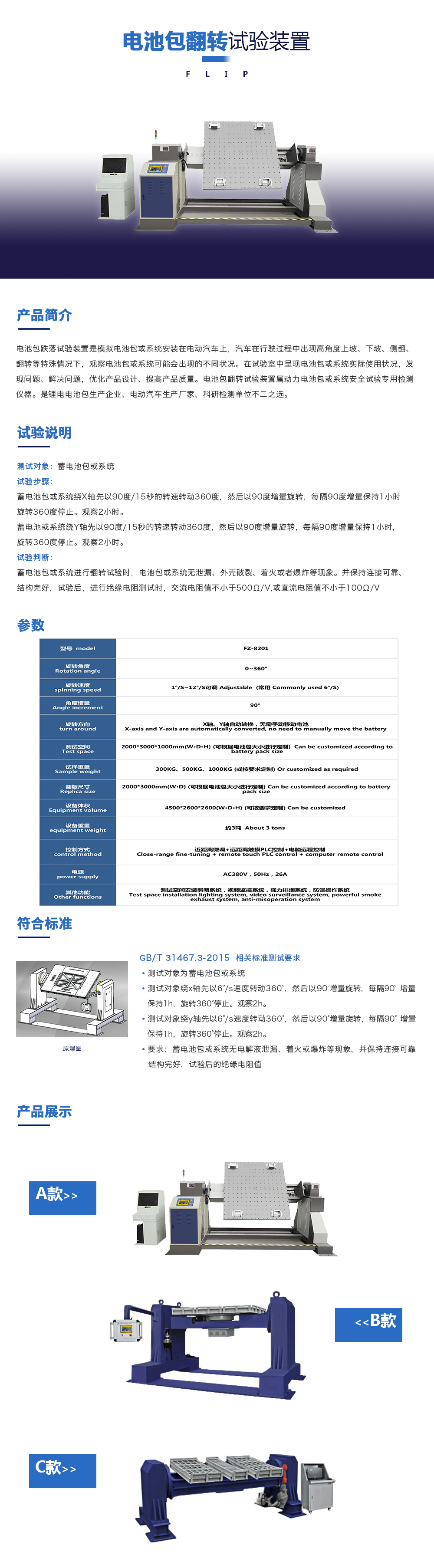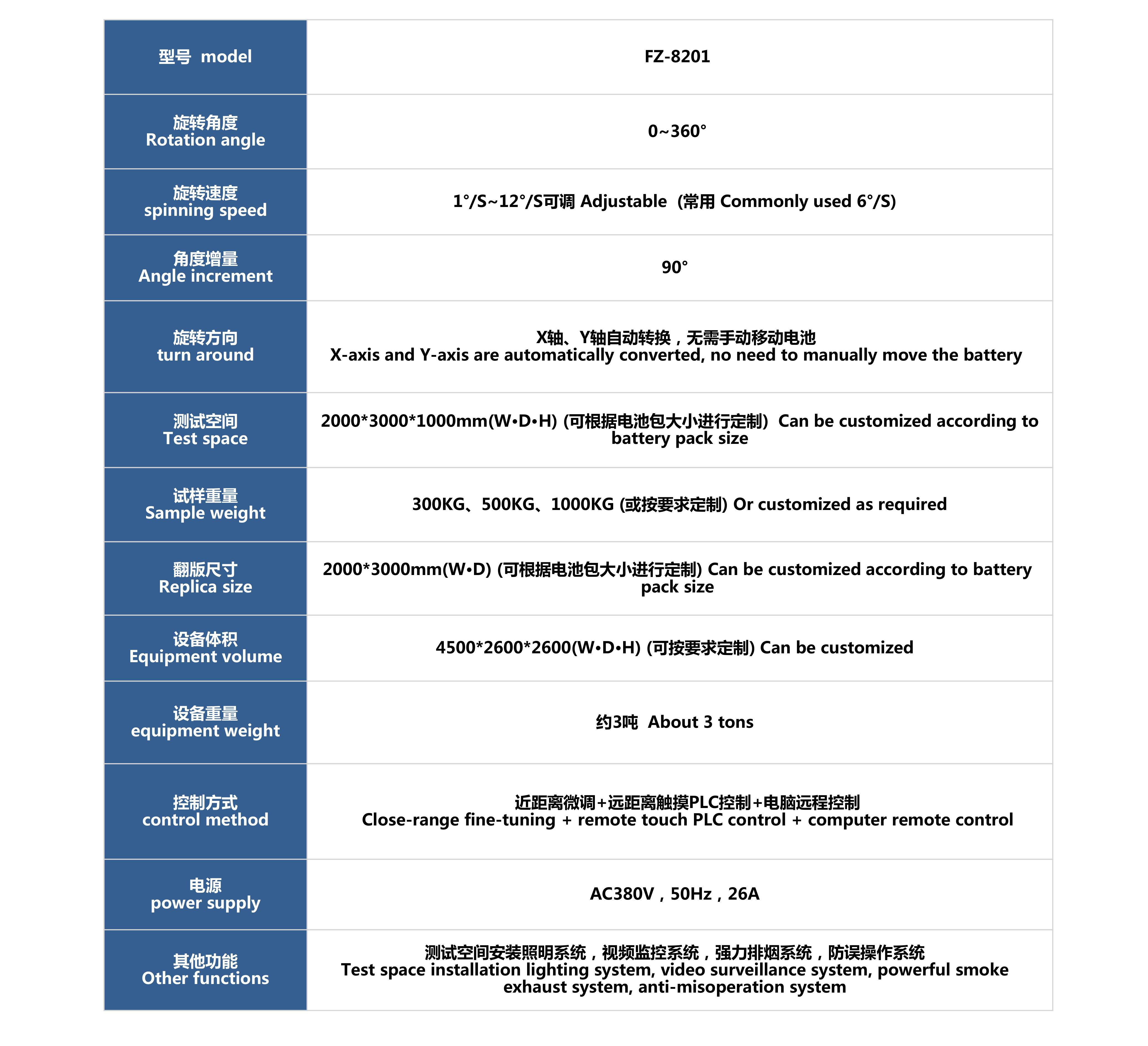 用途:電池包翻轉試驗臺是模擬電池包或系統(tǒng)安裝在電動汽車上,汽車在行駛過程中出現(xiàn)高角度上坡、下坡、側翻、翻轉等特殊情況下,觀察電池包或系統(tǒng)可能會出現(xiàn)的不同狀況。在試驗室中