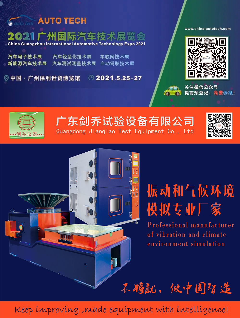 2021年5月25-27日,廣東劍喬試驗(yàn)設(shè)備有限公司【劍喬儀器】將攜旗下最新試驗(yàn)設(shè)備亮相AUTO TECH 2021 中國·廣州第八屆國際汽車技術(shù)展覽會(huì),現(xiàn)場(chǎng)展示:振動(dòng)試驗(yàn)系統(tǒng)、溫濕度振動(dòng)三綜合箱、高低溫防爆試驗(yàn)箱、高加速?zèng)_擊試驗(yàn)臺(tái)、電池?zé)釣E用試驗(yàn)機(jī)、電池短路試驗(yàn)箱、等試驗(yàn)設(shè)備及動(dòng)力電池相關(guān)試驗(yàn)解決方案。