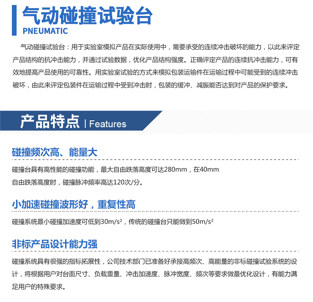 用途:氣動碰撞試驗臺:用于實驗室模擬產品在實際使用中,需要承受的連續沖擊破壞的能力,以此來評定產品結構的抗沖擊能力,并通過試驗數據,優化產品結構強度。正確評定產品的連續